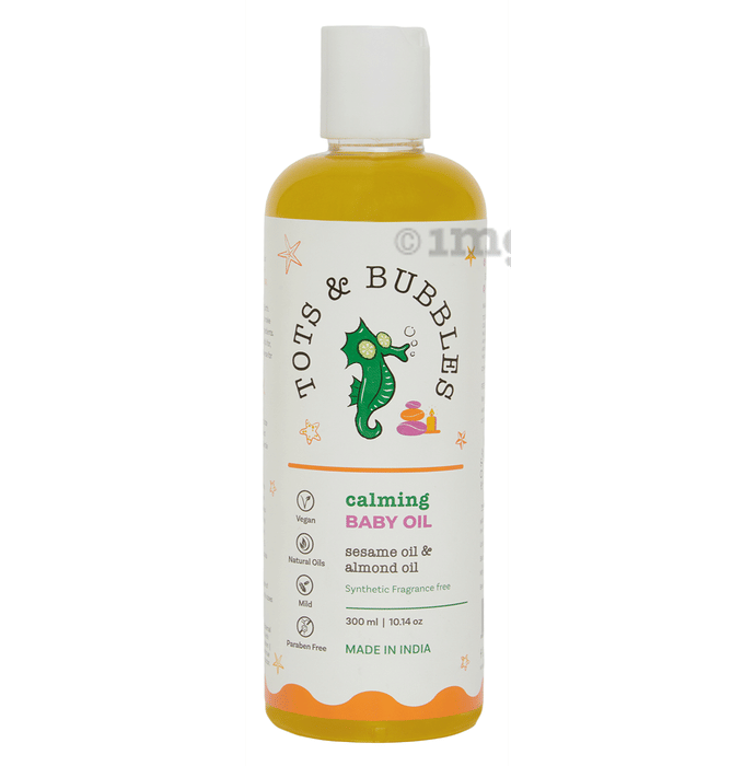 Tots and Bubbles Calming Baby Oil is a mild baby oil made with sesame oil and almond oil. It is dermatologically tested, vegan, and free from synthetic fragrance, parabens, silicones, mineral oil, SLS, and petrolatum. This oil is designed for babies aged 0–5 years and provides gentle care while maintaining skin softness and nourishment.