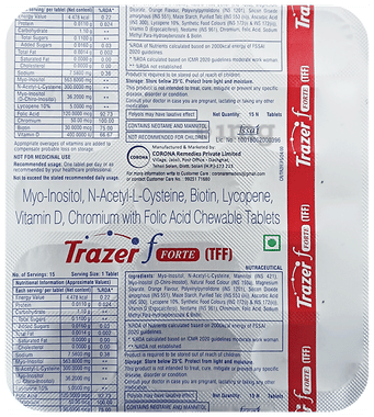 Trazer F Tablet is a dietary supplement consisting of amino acids, vital minerals and vitamins, which are necessary for the efficient functioning of the various systems of the body. The combination of ingredients helps boost immunity and strength. This supplement can help maintain eyes, brain, heart, and bone health. It contains key nutrients that are important to fill dietary gaps.