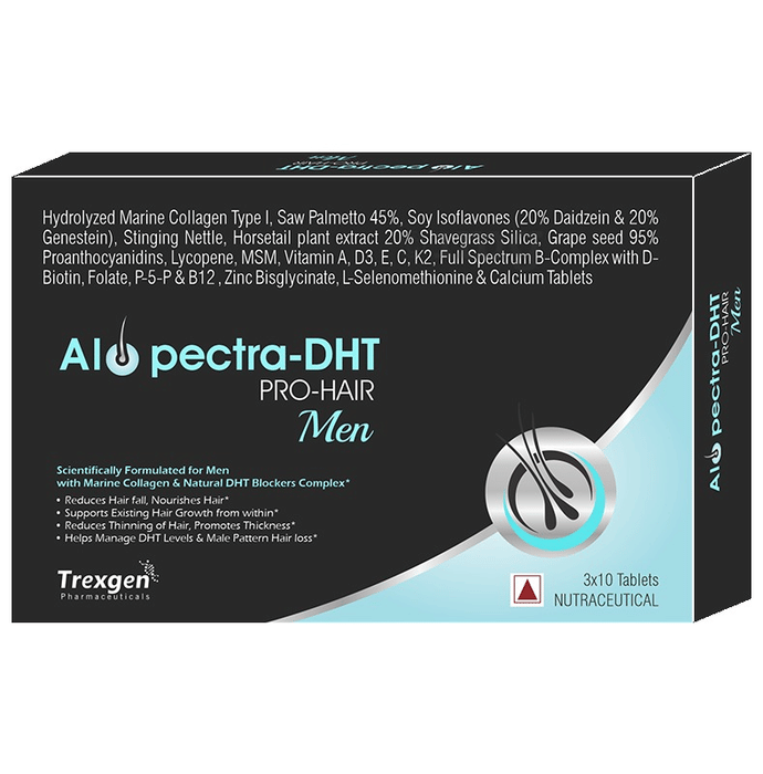 Trexgen Alopectra-DHT Pro Hair Men Alopecia Care Tablet is a next-generation formula for alopecia in men/male pattern hair loss that utilises marine collagen Type I, effective DHT blockers like saw palmetto fatty acids, soy isoflavones, red clover and stinging nettle. Enriched with horsetail plant, MSM, iycopene with antioxidants grape seed and complete vitamin complex with zinc bis-glycinate, selenium and calcium. Together, Alopectra Men helps manage male pattern hair loss and reduces hair fall, hair thinning, reduces DHT levels, promotes hair growth and helps reduce baldness and patchy hair loss. It also reduces inflammation at hair follicles and improves blood circulation at follicles.