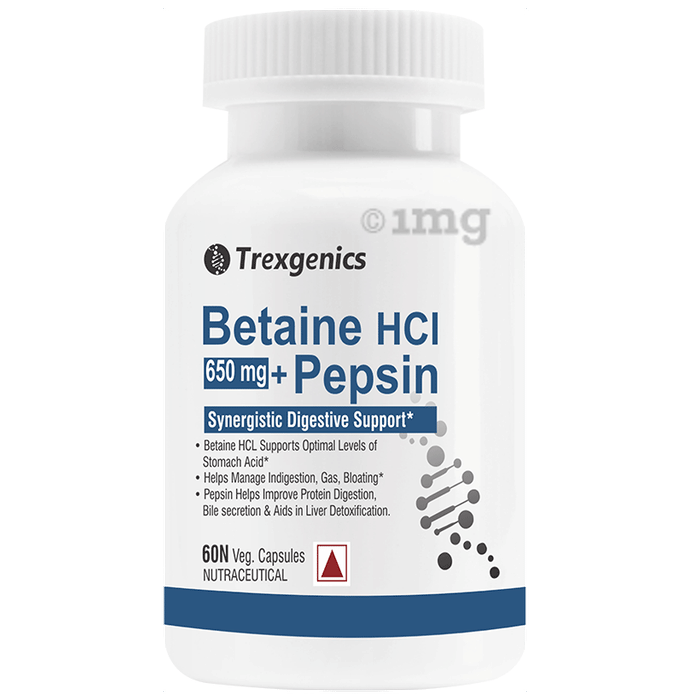 Trexgenics Betaine HCl + Pepsin Veg Capsule is a nutraceutical supplement formulated with 650 mg of Betaine Hydrochloride (HCl) and 200 mg of Pepsin (3000 FCC/mg) per capsule. Betaine HCl is a source of hydrochloric acid which may help support optimal gastric acid levels in the stomach, thereby assisting the digestive process. Pepsin, a proteolytic enzyme sourced from porcine origin, can help support the breakdown of dietary proteins and contribute to healthy digestion. The combination of these ingredients can assist in the digestion of food and the management of occasional indigestion, bloating, and discomfort. These capsules are made with non-GMO ingredients and contain no added artificial colours or flavours.
