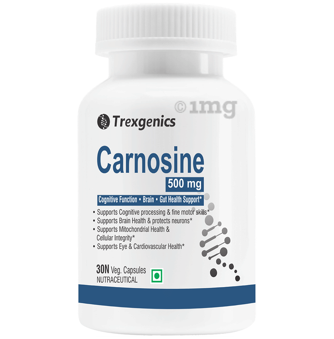 Trexgenics Carnosine Veg Capsule is a nutraceutical formulation containing 500 mg of L-Carnosine per serving. L-Carnosine is a naturally occurring dipeptide composed of beta-alanine and histidine, found in high concentrations in the brain, muscle, and other tissues. This supplement may help support healthy cognitive function and brain cell integrity. It can assist in supporting cellular energy production and activity, thereby contributing to overall cellular health. L-Carnosine may also help contribute to eye and cardiovascular wellness. These vegetarian capsules are free from artificial colours and flavours and are made with non-GMO ingredients.