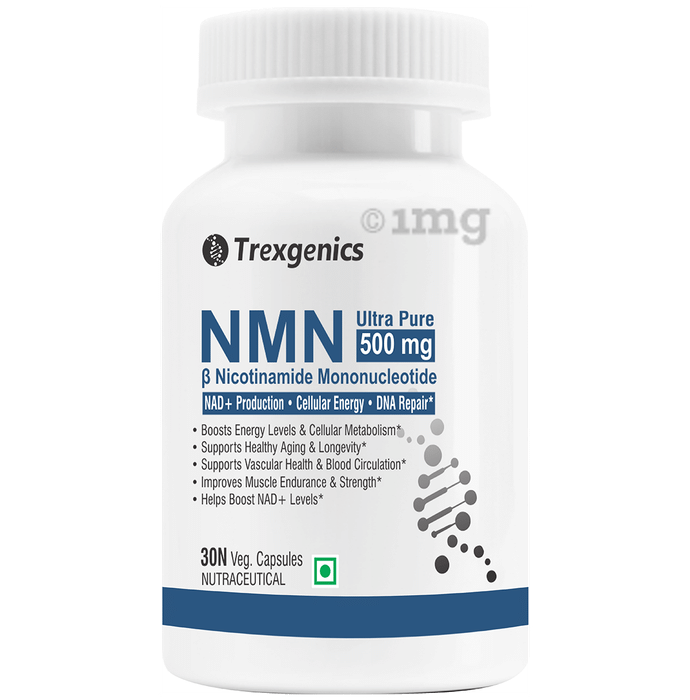 Trexgenics NMN Ultra Pure 500mg Veg Capsule is a nutraceutical supplement containing 500 mg of ß-Nicotinamide Mononucleotide (NMN) per capsule. NMN is a direct precursor to NAD+ (Nicotinamide Adenine Dinucleotide), a molecule that can assist in energy metabolism and cellular function. This NMN formulation can help contribute to cellular energy balance and cellular function. It may also assist in maintaining DNA repair, vascular function, and muscle endurance. Suitable for adults, this product is formulated using non-GMO ingredients and contains no added artificial colours, flavours, preservatives, or sweeteners. It is designed for those seeking structured nutritional support for healthy ageing, cellular health, and energy maintenance.