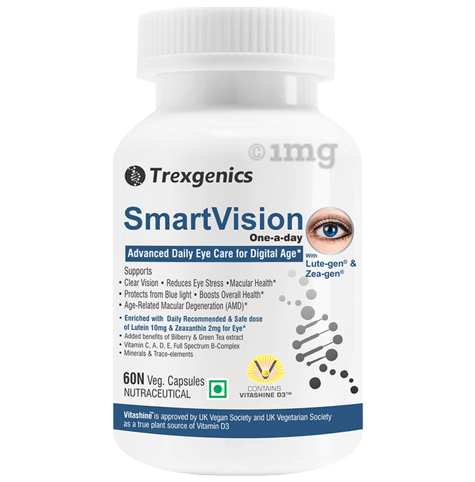 Trexgenics SmartVision Veg Capsules works as a Comprehensive Daily Eye care formula for strong vision in digital age of regular Smart phone use to protect eyes from damage. SmartVision utilizes Lutein, Zeaxanthin & Billberry with green tea to boost macular health with powerful antioxidant activity. SmartVision incorporates Daily Multivitamins with Full Spectrum B-Complex & Minerals for Eye health and overall healthy functioning of body.