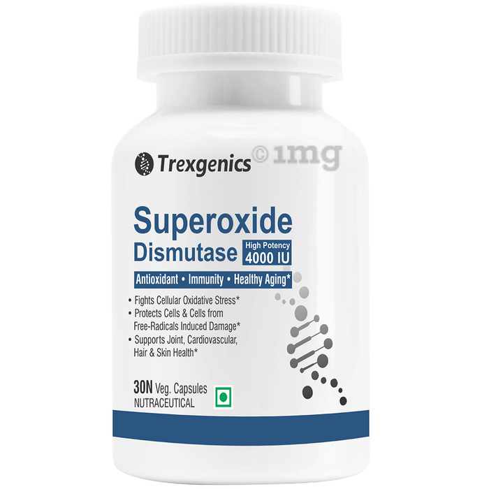 Trexgenics Superoxide Dismutase 4000 IU Veg Capsule is a nutraceutical supplement formulated with high-potency Superoxide Dismutase (SOD), delivering 4000 IU per capsule. SOD is an antioxidant enzyme that may help neutralise superoxide radicals, one of the primary reactive oxygen species in the body. This formulation is designed to help support cellular protection from oxidative stress and may contribute to healthy ageing, joint wellness, and general immune resilience. Sourced from a 200 mg enzyme concentrate (20,000 IU/gm), the supplement is manufactured using non-GMO ingredients and contains no added artificial colours, flavours, sweeteners, or preservatives.