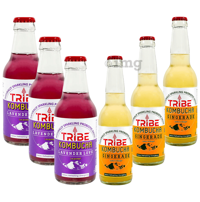 Tribe Kombucha Combo Pack of Naturally Sparkling Probiotic Drink Ginger, Blue Pea flower, Lavender & Lemon (210ml Each) is a delightful assortment of their most popular flavors! This pack includes two refreshing varieties: Gingerade and Lavender Love, each crafted to perfection with the finest ingredients. Whether you're a kombucha connoisseur or new to the trend, this combo pack is the perfect way to experience the probiotic goodness of Tribe Kombucha. Elevate your wellness routine with every sip!