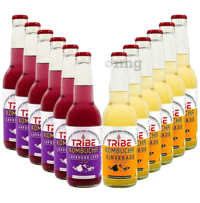 Tribe Kombucha Combo Pack of Naturally Sparkling Probiotic Drink Ginger,Blue Pea flower, Lavender & Lemon (330ml Each) is a delightful assortment of their most popular flavors! This pack includes two refreshing varieties: Gingerade and Lavender Love, each crafted to perfection with the finest ingredients. Whether you're a kombucha connoisseur or new to the trend, this combo pack is the perfect way to experience the probiotic goodness of Tribe Kombucha. Elevate your wellness routine with every sip!