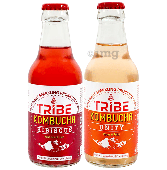 Tribe Kombucha Combo Pack of Naturally Sparkling Probiotic Drink Rose, Tulsi, Hibiscus & Lemon (210ml Each)is a delightful assortment of their most popular flavours! This pack includes two refreshing varieties: unity and hibiscus, each crafted to perfection with the finest ingredients. Whether you're a kombucha connoisseur or new to the trend, this combo pack is the perfect way to experience the probiotic goodness of Tribe Kombucha. Elevate your wellness routine with every sip!