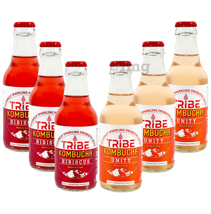 Tribe Kombucha Combo Pack of Naturally Sparkling Probiotic Drink Rose, Tulsi, Hibiscus & Lemon (210ml Each)is a delightful assortment of their most popular flavours! This pack includes two refreshing varieties: unity and hibiscus, each crafted to perfection with the finest ingredients. Whether you're a kombucha connoisseur or new to the trend, this combo pack is the perfect way to experience the probiotic goodness of Tribe Kombucha. Elevate your wellness routine with every sip!