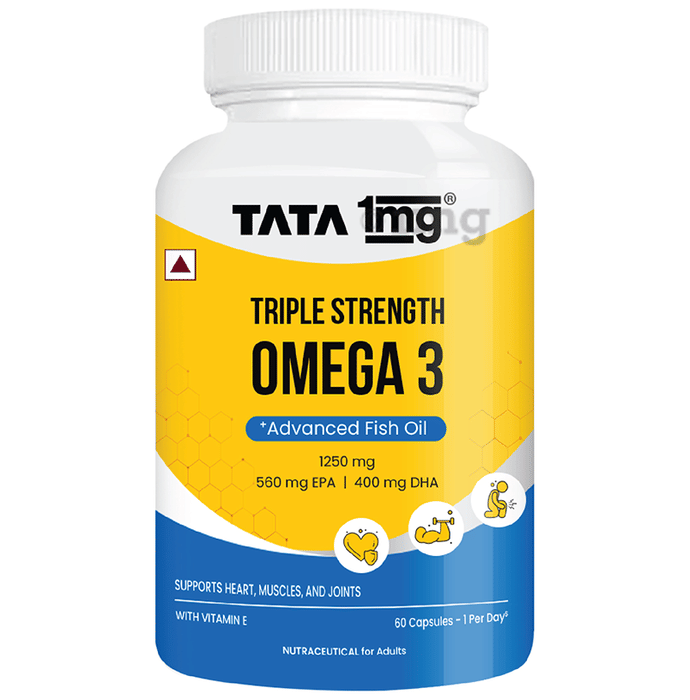 Tata 1mg Triple Strength Omega-3 Fish Oil Capsule contains 960 mg of essential omega-3 fatty acids (560 mg of EPA and 400 mg of DHA). Omega-3 fatty acids provide essential fatty acids for overall health and support joint and muscle functioning as well. These fatty acids also support skin and eye health, brain and cognitive health.