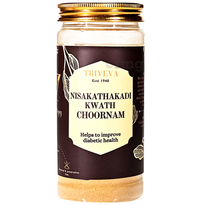 Triveva Nisakathakadi Kwath Choornam is an Ayurvedic syrup that can help deal with high blood sugar levels. It can effectively lower the blood glucose level and reduces insulin resistance. It also has antioxidants and anti-inflammatory properties.