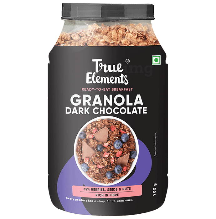 - Q. What are the main ingredients in True Elements Dark Chocolate Granola? The main ingredients include rolled oats, wheat flakes, dried cranberries, seeds (watermelon and sesame), raw honey, jaggery, almonds, natural alkalized cocoa powder, oat flour, desiccated coconut, soybean oil, natural chocolate flavour, and rosemary extract.