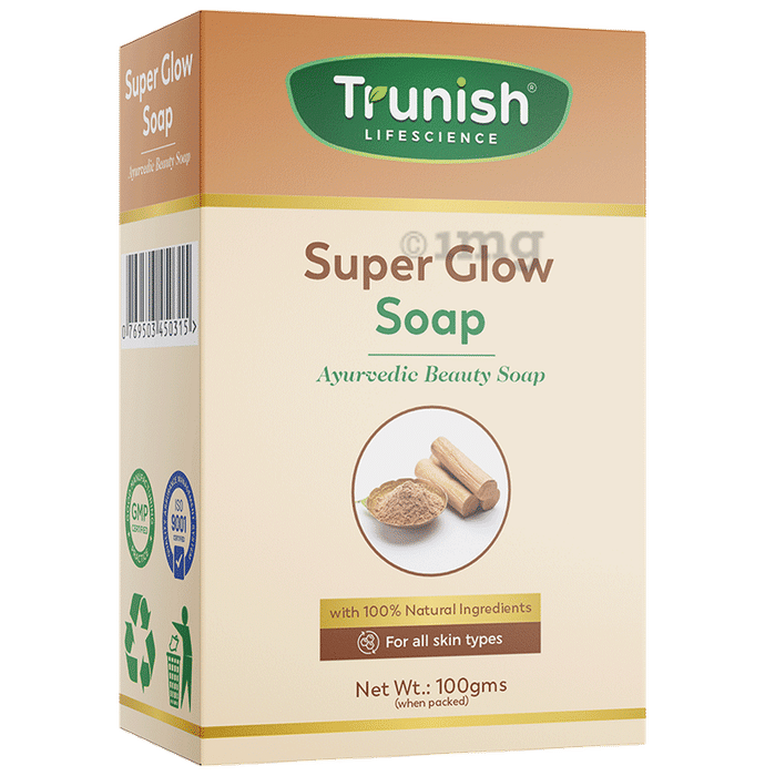 Trunish Lifesciences Super Glow Soap is an Ayurvedic cleansing bar that blends the skin-purifying benefits of sandalwood with the detoxifying power of manjistha. The creamy lather helps cleanse the skin gently, while the herbal formulation may assist in supporting clearer, brighter, and more balanced skin tone. Ideal for daily use, it offers a naturally refreshing experience with every wash.