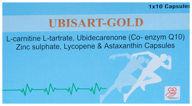 - Ubiquinol Acetate 150 mg, Alpha Lipoic Acid 50 mg, Resveratrol 30 mg, Piperine 2.5 mg, Vitamin E 7.5 mg, Vitamin B12 2.2 mcg, Vitamin D3 100 IU, Zinc sulphate eq. to Zinc 17 mg, Sodium selenate eq. to Selenium 40 mcg, L-Arginine 50 mg, L-Carnitine 40 mcg