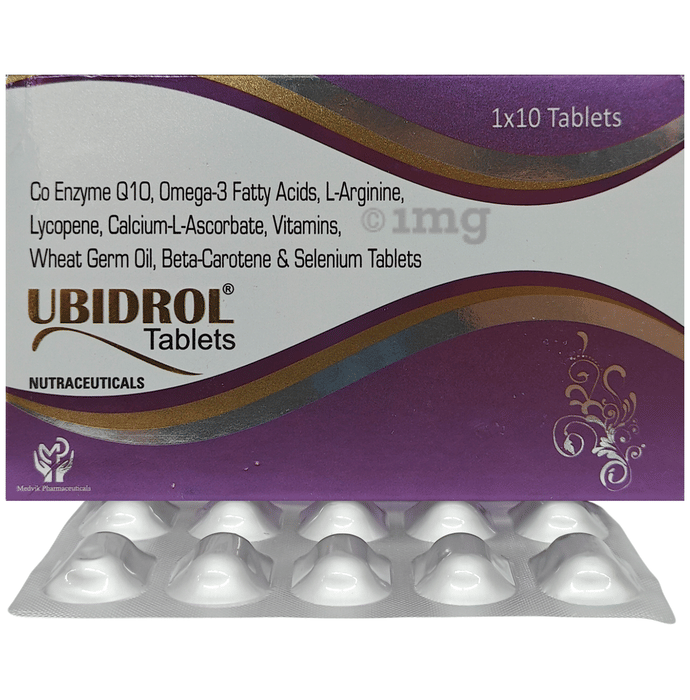 Ubidrol Tablet Ubidrol Tablet is a tablet that can reduce nutritional deficiencies. It may help maintain overall wellness and energy levels. Key Ingredients: Co-Enzyme Q10,Omega 3 Fatty Acid- Eicosapentaenoic Acid (EPA),Dicosahexaenoic Acid (DHA),L-Arginine,Lycopene 10%,Selenium Dioxide,Mixed Carotene 10%,Calcium Ascorbate,Wheat Germ Oil,Zinc Sulphate Monohydrate,Vitamin B12,Piperine Key Benefits: