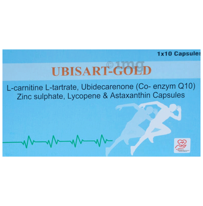 Ubisart Gold Capsule is a specialised dietary supplement formulated with a combination of L-carnitine L-tartrate, Co-enzyme Q10 (Ubidecarenone), Zinc sulphate, Lycopene, and Astaxanthin to support cellular energy, antioxidant defense, and overall wellness. Each hard gelatin capsule delivers a blend of nutrients and antioxidants that play essential roles in energy metabolism, cellular protection, and immune support, making it suitable for adults seeking to maintain optimal physiological function and vitality.