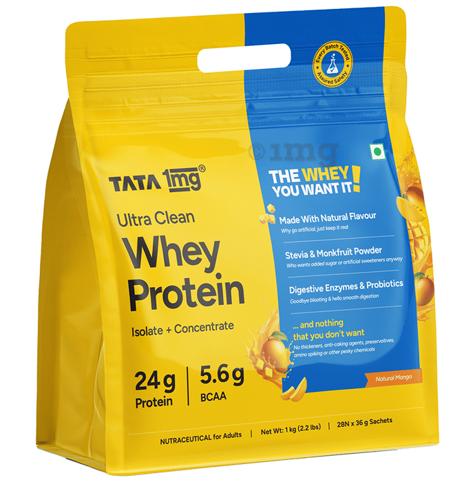 Information about Ultra Clean Whey Protein Powder | 24g Protein, 5.6g BCAAs per Serve | 1kg Pack | by Tata 1mg | Natural Mango