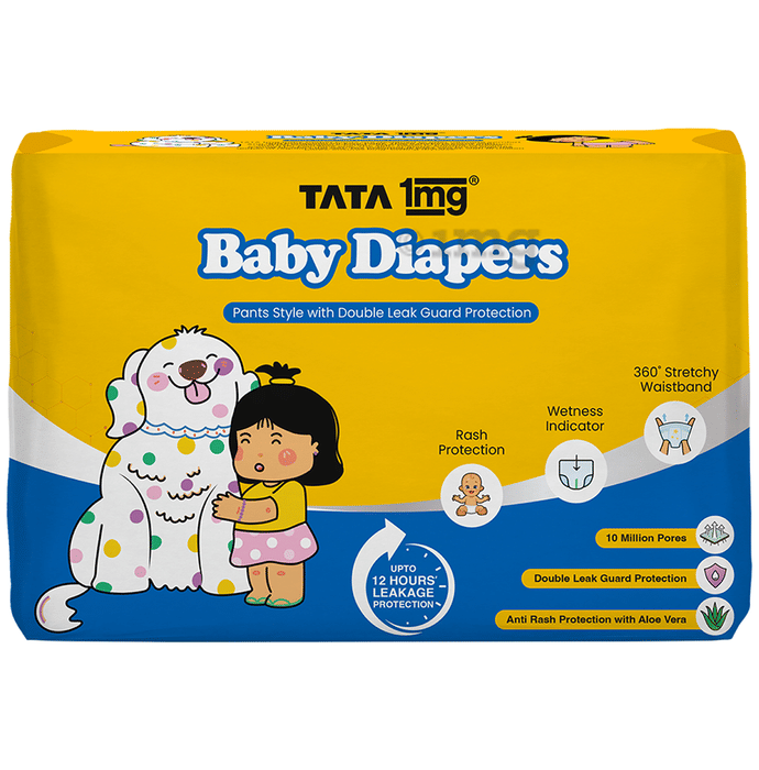 Tata 1mg Baby Diaper Pants come with Anti-Rash lotion with Aloe Vera*, ensuring your baby's delicate skin stays soft and rash-free. These pant-style diapers provide all-round protection while keeping your baby comfortable and dry. Designed with up to 12-hour absorption, these diapers help lock in wetness, keeping your baby fresh and worry-free. The double leak guard protection offers an extra layer of security, preventing leaks and keeping your baby’s clothes dry. The flexible waistband adapts to your baby’s movements, allowing for a comfortable, snug fit without discomfort. A cotton-like soft top layer adds extra coziness, making sure your baby sleeps peacefully. The breathable, cotton-like material ensures softness and airflow, reducing the chances of skin discomfort. Available in all sizes – Newborn, Small, Medium, Large, and Extra Large diapers.