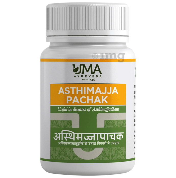 Uma Ayurveda Asthimajjapachak Tablet is an Ayurvedic proprietary formulation that is specially designed to help support the wellness of asthi (bone) and majja (marrow) dhatus in the body. This blend is enriched with botanicals such as Guduchi, Amalaki, and Musta that have balancing properties. This formulation can be helpful for individuals dealing with bone and joint discomforts such as pricking pain, joint stiffness, or general weakness in bones. It may also provide comfort in conditions linked with Vataroga and can be supportive in managing associated discomforts such as toothache, heaviness in the eyes, and occasional vertigo. The ingredients used in this formulation have deepana-pachana properties, which may support healthy digestion and dhatu metabolism.