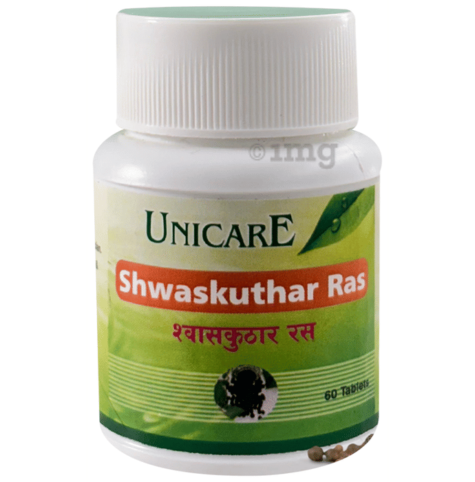 Unicare Shwaskuthar Ras Tablet is a formulation is crafted with herbal ingredients that may help support respiratory and digestive wellness. It may help in soothing throat irritation, managing discomfort linked to cough and congestion, and supporting clear breathing. Alongside respiratory care, it also supports smooth digestion, bowel regularity, and relief from common digestive discomforts like bloating or irregularity, thereby contributing to overall daily well-being.