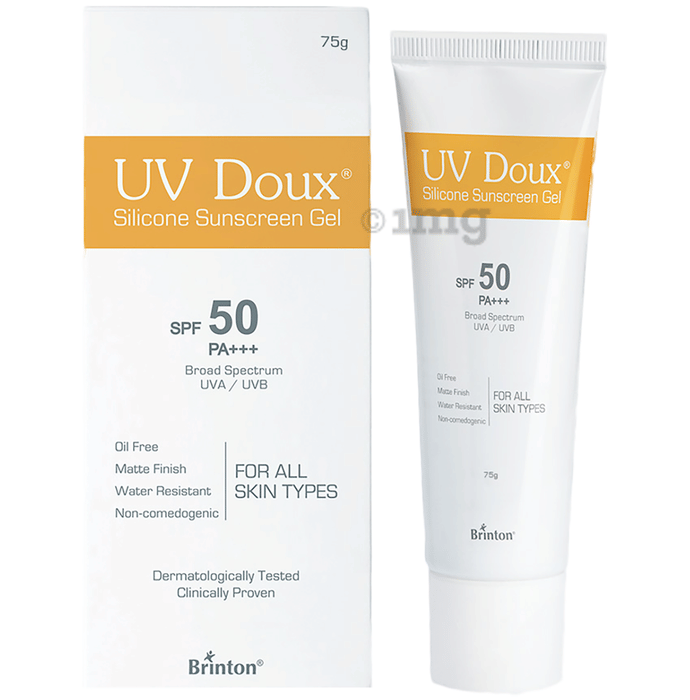 UV Doux Silicone Sunscreen Gel SPF 50 PA+++ is a dermatologically tested and clinically proven formula that contains physical UV blockers (zinc oxide, titanium dioxide) and chemical UV blockers (bemotrizinol) and provides broad spectrum protection against UVA and UVB, thus protecting the skin against damage and tanning. It provides a matte finish inhibits the formation of radicals and helps in sebum control in acne-prone patients. No balling effect on the skin is observed when rubbed.