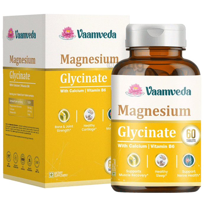 Vaamveda Magnesium Glycinate Tablet is a supplement featuring magnesium glycinate, calcium, and vitamin B6 to help meet daily mineral needs. Magnesium glycinate can be used for its high bioavailability and potential digestive tolerance, while calcium and vitamin B6 are included for their synergistic roles to assist in supporting muscular and bone health. This product is developed for individuals seeking a balanced approach to daily wellness, especially in areas related to muscle comfort, sleep quality, and nervous system function.
