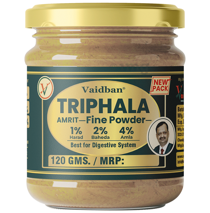 Vaidban Triphala Fine Powder contains a combination of three well-known herbs amla, harad, and bahera. These three fruits help the bowel's smooth functioning and relieve constipation.