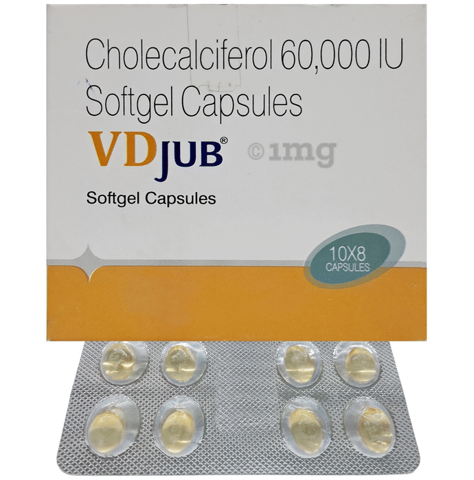 Vdjub Soft Gelatin Capsule is a vitamin D3 supplement which is primarily used to manage and prevent vitamin D3 deficiency. Vitamin D3 is essential for the growth, formation, and maintenance of healthy bones. Lack of this essential vitamin may cause several bone-related disorders such as osteoporosis, hypoparathyroidism, and rickets. Vitamin D3 is also required for numerous bodily processes, like calcium absorption. It is needed to keep the bones strong and prevents any conditions associated with weak and brittle bones.