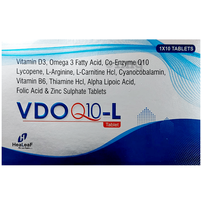 VDO Q10 L Tablet is a dietary supplement formulated with essential vitamins, minerals, amino acids, and antioxidants that may help support overall health and well-being. It contains Omega-3 fatty acids, Co-Enzyme Q10, Lycopene, and a range of essential B vitamins that may help contribute to cellular energy production, cardiovascular wellness, and immune function. This formulation may help assist in maintaining physiological balance by providing necessary micronutrients for metabolic and enzymatic processes. Designed to be taken under healthcare supervision, this supplement may help fill nutritional gaps and support overall vitality.