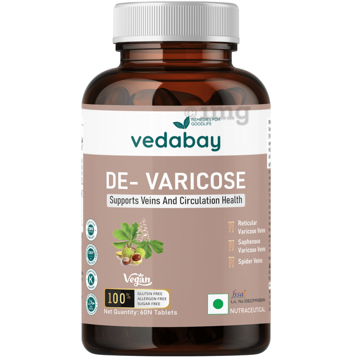 Vedabay De-Varicose Tablet is specifically designed to address the conditions associated with varicose veins. It contains key ingredients such as horse chestnut, known for its ability to improve circulation and reduce swelling in the legs. Additionally, ginkgo biloba supports blood flow and strengthens blood vessel walls, while centella asiatica helps in collagen production, promoting skin elasticity and vein health. Citrus sinensis provides antioxidant support, helping to protect against oxidative stress. Together, these ingredients work synergistically to alleviate symptoms associated with varicose veins, promoting improved vascular health and overall well-being.