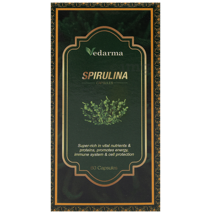 Vedarma Spirulina Capsule is formulated with natural Spirulina which is known for its rich nutrient profile. It contains essential amino acids, vitamins, and minerals that may help promote overall well-being. This supplement may help support immune health, promote skin and hair vitality, and contribute to overall stamina and strength.