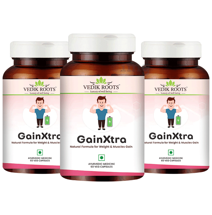 Vedikroots GainXtra Veg Capsule is an Ayurvedic supplement formulated with a blend of herbal ingredients to support overall nourishment. It is designed to help the body absorb essential nutrients that may assist a balanced weight and support muscle wellness. The formulation contains Shatavari, Ashwagandha, Mulethi, Triphala, and Pippali, which can work synergistically to support digestive strength and nutrient assimilation. This herbal-based wellness alternative can help support vitality and physical well-being through balanced nutrient support.