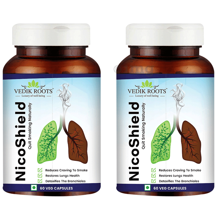 Vedikroots NicoShield Veg Capsule is formulated with a blend of botanical extracts to help support respiratory wellness and promote overall vitality. The formulation is designed to assist the body’s natural detoxification processes and may help maintain lung and bronchial comfort. It may also help support mental resilience and general well-being during phases of lifestyle adjustment.