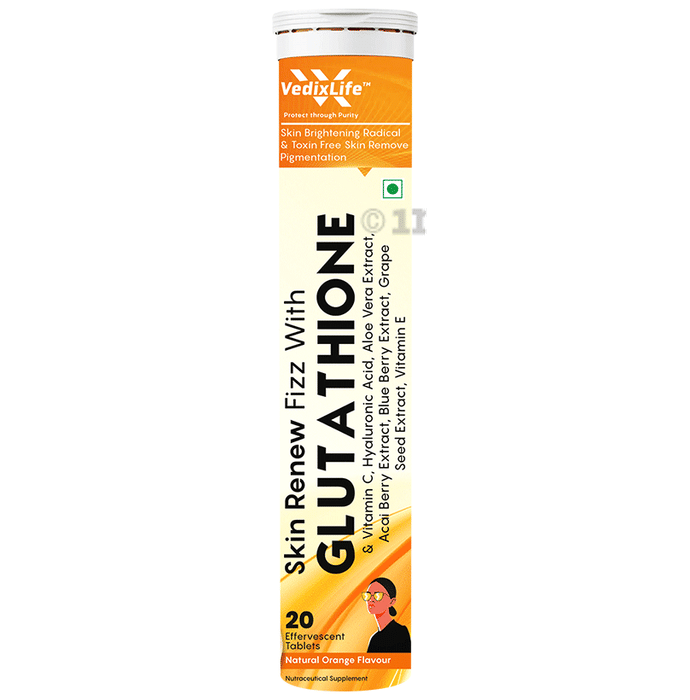 VedixLife Skin Renew Fizz with Glutathione Effervescent Tablet (20 Each) Natural Orange is a sugar-free effervescent tablet formulated with L-Glutathione, Vitamin C, Hyaluronic Acid, Aloe Vera, and fruit extracts. It dissolves in water to create a refreshing orange-flavoured drink that can be included in daily skincare nutrition routines. Suitable for vegetarians, this formula is free from gluten, soy, sugar, and nuts, and may support overall skin wellness as part of a balanced lifestyle.