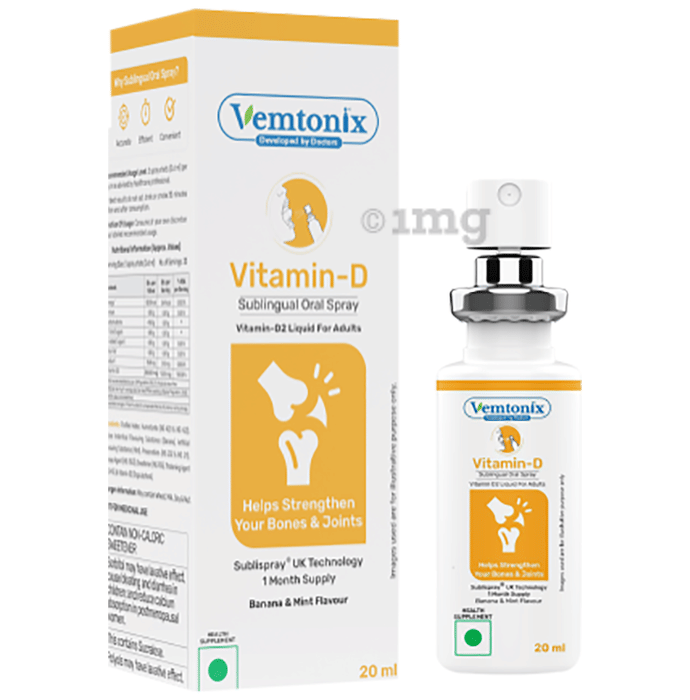 Vemtonix Vitamin-D Sublingual Oral Spray Banana and Mint is a health supplement designed for adults, containing Vitamin D2 in liquid form for sublingual use. It can help deliver the vitamin directly under the tongue. The formula is available in banana and mint flavours and can support the maintenance of bone, joint, and overall wellbeing.