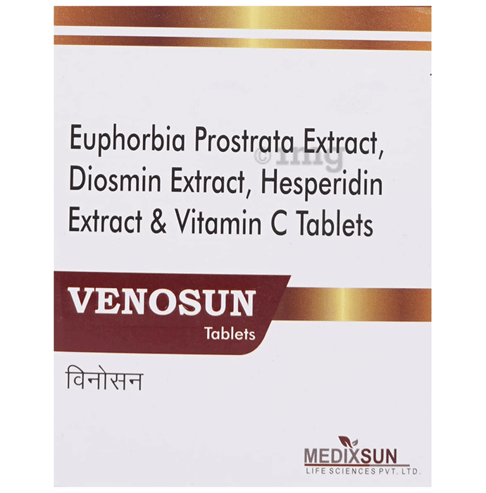 Venosun Tablet is a dietary supplement crafted with a blend of botanical extracts and nutrients to help support vascular health and circulatory comfort. Each tablet delivers Diosmin and Hesperidin, both bioflavonoids, along with Euphorbia Prostrata extract and Vitamin C. This combination may help maintain the structural integrity of blood vessels and contribute to daily wellness routines. Vitamin C contributes to normal collagen formation, which is important for healthy blood vessels.