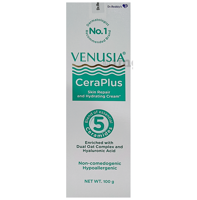 Venusia Ceraplus Cream is a unique combination of 5 essential ceramides that help restore the protective skin barrier. Dual Oat complex may help soothe skin, reduce water loss and protect the skin from further damage. Hyaluronic Acid retains moisture, and nourishes and rejuvenates skin. It may help nourish and strengthen the skin's natural barrier. This cream may help control visible signs of ageing, soothe irritation, and maintain skin elasticity and flexibility for a radiant complexion.