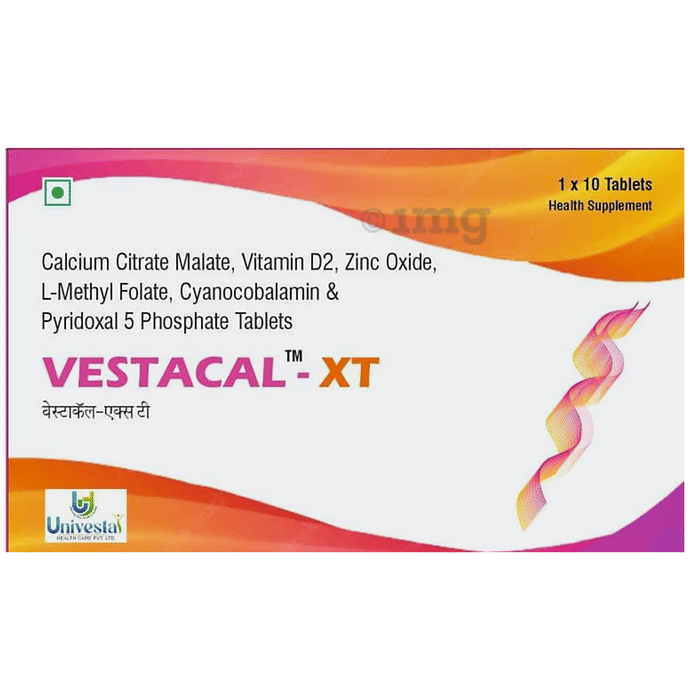 Vestacal-XT Tablet is a health supplement enriched with Calcium Citrate Malate, Vitamin D2, Zinc, L-Methyl Folate, and active B-vitamins like Cyanocobalamin and Pyridoxal-5-Phosphate. It may help support bone density, calcium absorption, and red blood cell synthesis. Ideal for individuals requiring bone support, vitamin D supplementation, or folate balance, this tablet can help ensure optimal musculoskeletal and hematologic health.