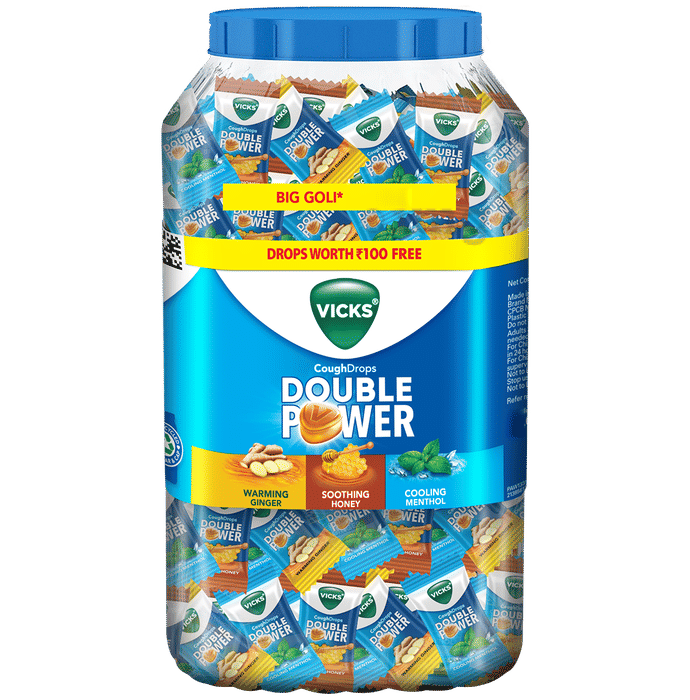 Vicks Double Power Cough Drops is a herbal lozenge formulation created with menthol, pudinah (Mentha arvensis leaf extract), honey, and ginger, blended in a flavoured sugar base. It can help support relief during episodes of throat irritation, dryness, or discomfort by offering cooling, soothing, and warming effects. The presence of menthol and pudinah extract can provide a refreshing cooling action, while honey can help coat the throat for smoothness, and ginger can contribute to a warming sensation that complements overall comfort. Designed in a convenient lozenge form, this product can be suitable for everyday throat wellness during mild irritation.