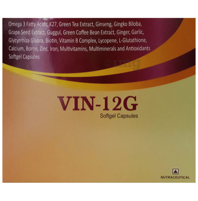 VIN 12G Softgel Capsules It is a dietary supplement formulated with ginseng, grape seed, omega-3 fatty acids and green tea extract that provides antioxidant support to your body. It helps produce cellular energy and serves as an antioxidant. It protects against free radicals and can reduce oxidative damage and inflammation, thus promoting heart health.