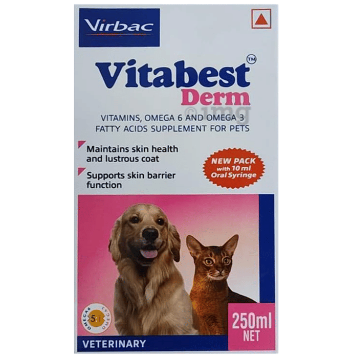 Vitabest Derm Pet Syrup is a dietary supplement specially formulated to support your pet's skin and coat health. Enriched with essential vitamins, Omega-6, and Omega-3 fatty acids, this syrup provides comprehensive nourishment to promote healthy skin, a shiny coat, and overall well-being in dogs and cats.