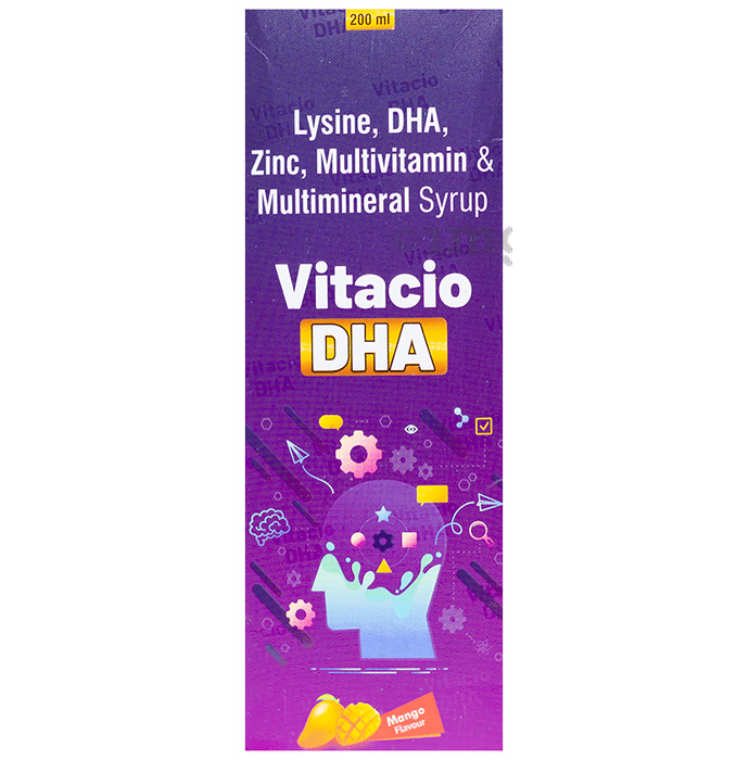 Vitacio DHA Orange Syrup is a comprehensive dietary supplement formulated to support overall health and well-being. It contains essential nutrients such as Lysine, DHA, Zinc, and a blend of multivitamins and multiminerals. This syrup is designed to help meet the nutritional needs of children and adults, promoting growth, cognitive function, and immune health.