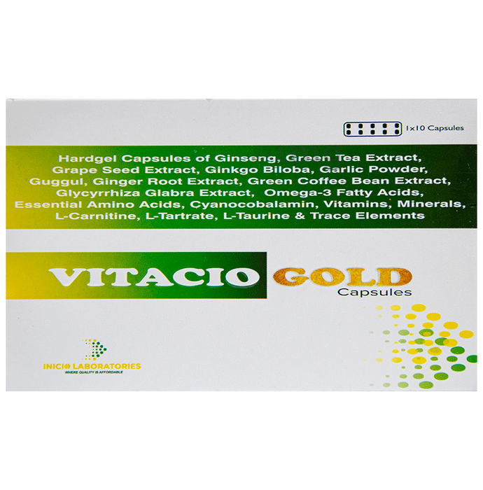 Vitacio Gold Capsules is a comprehensive dietary supplement designed to support overall health and well-being. These hard gel capsules combine a variety of natural extracts, vitamins, minerals, and essential amino acids to provide a wide range of health benefits. The formulation includes powerful antioxidants, energy-boosting compounds, and essential nutrients to enhance vitality and support various bodily functions.