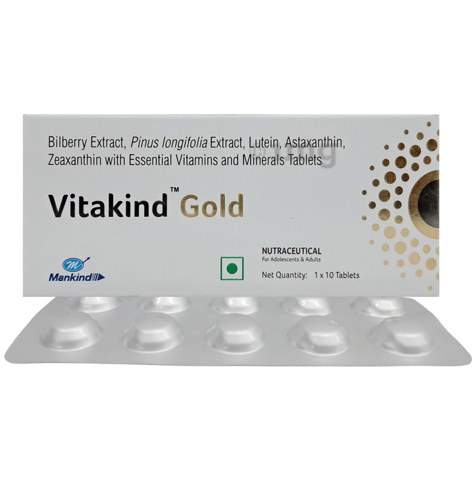 Vitakind Gold Tablet is a health supplement that is specifically designed to support good eye health and the proper functioning of the retina. The individual nutrients in the supplement have various benefits for eye health, including reducing the risk of age-related macular degeneration, improving visual acuity, and protecting the eyes from harmful blue light.