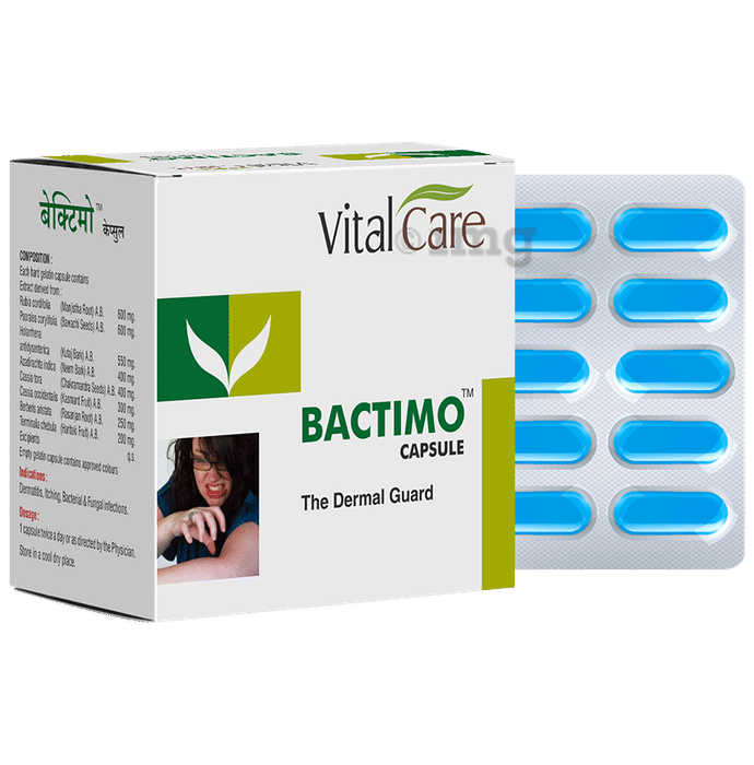 Vital Care Bactimo Capsule are natural antifungal capsules. It contains herbal ingredients that provide natural antifungal and antibacterial properties. It can be used to tackle skin infections. It is an organic product and has no harmful chemicals in it.