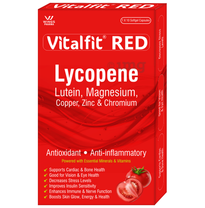 Vitalfit Red Softgel Capsule is an antioxidant and anti-inflammatory dietary supplement enriched with essential minerals and vitamins. Formulated with Lycopene, Lutein, Magnesium, Copper, Zinc, and Chromium, it may help support cardiac and bone health, improve vision and eye health, and enhance immunity and nerve function.