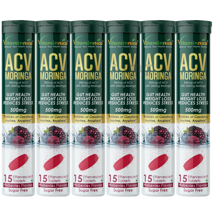 Vitaminnica ACV Moringa Effervescent Tablet Mixberries Sugar-Free is a refreshing and convenient daily wellness supplement combining 300mg of Apple Cider Vinegar and 200mg of Moringa in each tablet. This tablet can help support digestion, metabolism, and energy levels. This dual-action formula is infused with nutrient-rich moringa and tangy apple cider vinegar to help offer a holistic health drink. The tablets are easy to dissolve, provide a fizzy and enjoyable mixberries flavour, and come in a sugar-free format—ideal for those seeking functional nutrition.