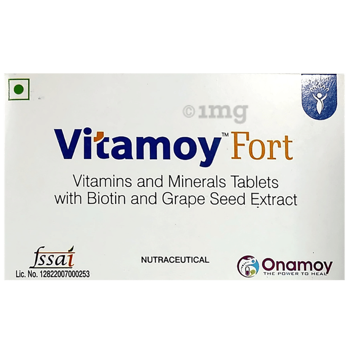 Vitamoy-Forte Tablet is a multivitamin and multimineral supplement loaded with the goodness of grape seed extract and biotin which is useful for various health benefits. It helps to enhance the immune system of the body. It is rich in antioxidants which help protect from cellular damage. It helps to improve eye, bone, hair and skin health. It helps to improve metabolism. It helps promote red blood cell production.
