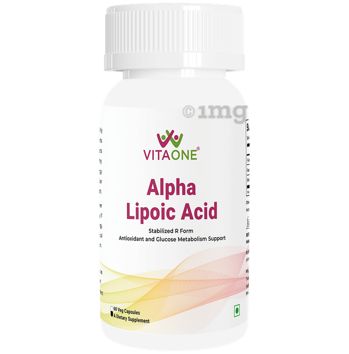 Vitaone Alpha Lipoic Acid Veg Capsule is a dietary supplement formulated with the stabilized R-form of ALA, the biologically active version which can be used for its better absorption and effectiveness. R-ALA plays a role in mitochondrial energy production and helps regenerate other antioxidants. It may support the body’s ability to neutralize oxidative stress, balance glucose metabolism, and improve overall vitality. This supplement is crafted to enhance cellular function and support overall wellness through its broad antioxidant action.