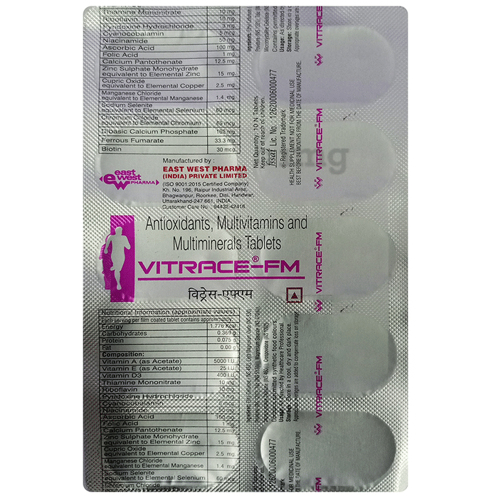 Vitrace - FM Tablet is a dietary supplement that contains a combination of vitamins, minerals, and antioxidants. This tablet is used as a nutraceutical supplement for vitamin deficiencies. It contains multivitamins, multi-minerals, and antioxidants that help replenish nutrient reserves in the body and support the proper functioning of tissues and cell growth.