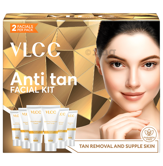 The Anti-Tan Facial Kit offers a perfect respite against a summer tan and gets you party ready, instantly. It helps remove sun tan, dark spots, and sun spots and provides your skin with an even, hydrated look. This Anti Tan Facial Kit is an easy 6-step routine that helps fade sun tan and aids in softening sun-exposed skin. The 6-step routine helps even patchy skin, replenishes damaged skin, and lightens sun spots and sun tan. This Anti Tan Facial Kit contains the following components: cleanser cum toner, oatmealsScrub, mela white gel, pista massage cream, mela white pack and moisturising gel.